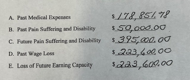 After we tried the case for a week, the jury returned its verdict and found the business establishment 100% at fault. That meant our client was entitled to collect 100% of the damages the jury awarded. The jury awarded our client compensation totaling $1,071,051.78. Here’s the jury award in the foreperson’s own handwriting: